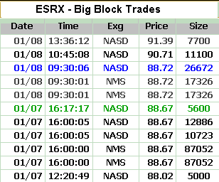 ESRX's tape action shows the recent big block trades. One can see the price for the blocks climbing from $88.02 on Thursday to a peak of $91.39 Friday.