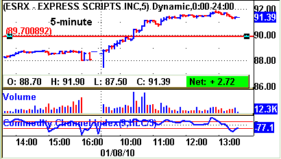 ESRX's 5-minute chart shows the stock breaking out in the mid-morning. Volume picked up intraday at the time of the breakout.