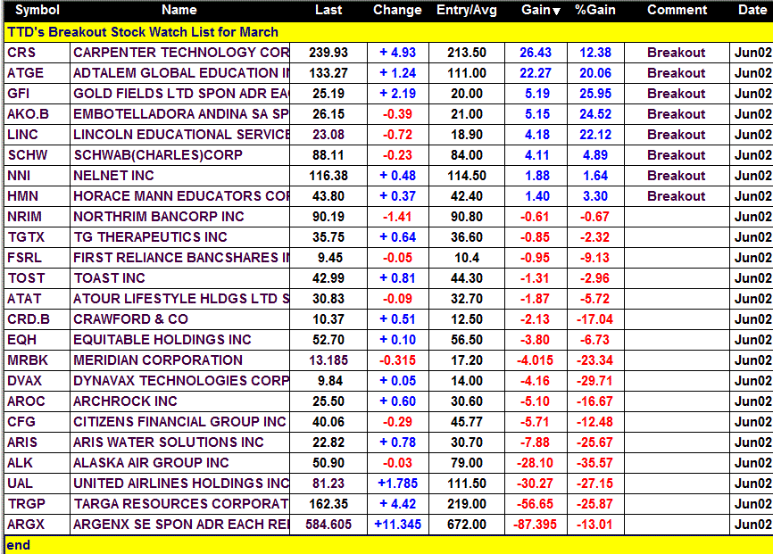 Guide: Symbol=Ticker, Name=Corporate name, Entry is the buy price to enter on the breakout, Last=prior close, Change=change from last close to prior, Date=date of price of close etc, Gain in blue is price above breakpoint (entry), Gain in red is price below breakpoint (entry)., % Gain in blue is % over breakpoint (entry), Gain in red is % below breakpoint (entry)