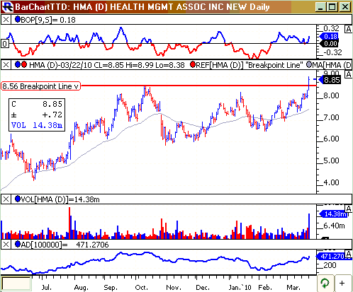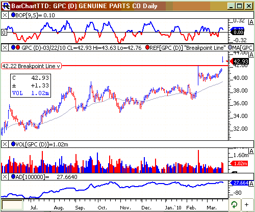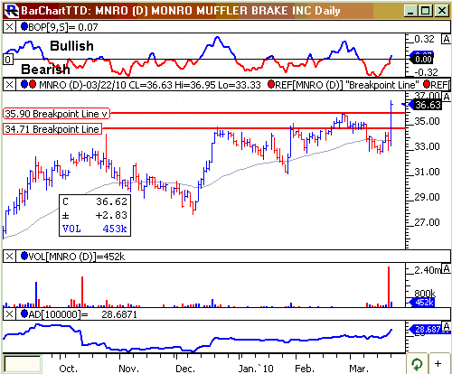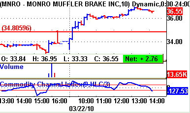 A look at MNRO's 10-minute chart shows the stock pushing through its breakpoint in the morning. It held at midday and the pushed higher in the afternoon.