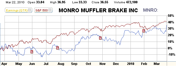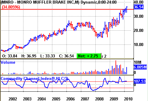 MNRO's long-term chart shows the stock advancing from 7 back in 2003 to a peak of 36. That is an excellent performance.
