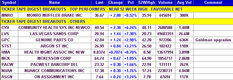 (The information contained has been prepared from data deemed reliable but there is no guarantee of complete accuracy. Ticker Tape Digest Inc. is not affiliated with any broker, dealer or investment advisor. Nothing in this publication constitutes an offer, recommendation or solicitation to buy or sell any securities. Further research is advised. This report is copyrighted and no redistribution is permitted with out permission. Some of the charts are from Telescan, Insight Trading, First Alert and other sources.)