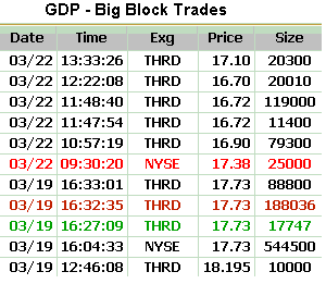 TTD's clip of the tape shows some heavy distribution in the stock. A big block of 544,500 shares traded on Friday near the close and went off at $17.73, down from the prior block of $18.19. A second block traded today. It was 119,000 shares crossing at $16.72. That was within a sequence of a series of blocks.