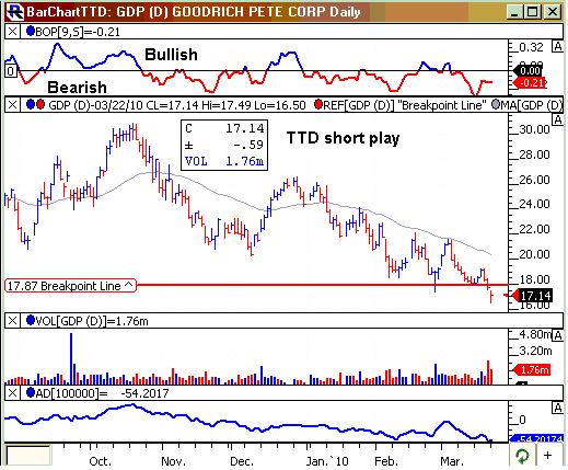 GDP, based in Houston, produces oil and gas from properties in East Texas and Northwest Louisiana. Annual revenues: $110 million. GDP's stock breaks below key support today setting off a TTD short play. Analysts expect the company to show a loss this year. So far today, GDP is trading 2 million shares, almost double its normal daily volume of 1.1 million shares.