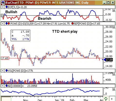 POWI, based in San Jose, Ca., makes high-voltage, analog integrated circuits for use primarily in alternating current to direct current power conversion. Annual revenues: $212 million. POWI moves lower today not participating in the stock market's rally. The stock has been trending lower and today cuts below key support. With profits to fall sharply, TTD sees good chances for more on the downside for bears.