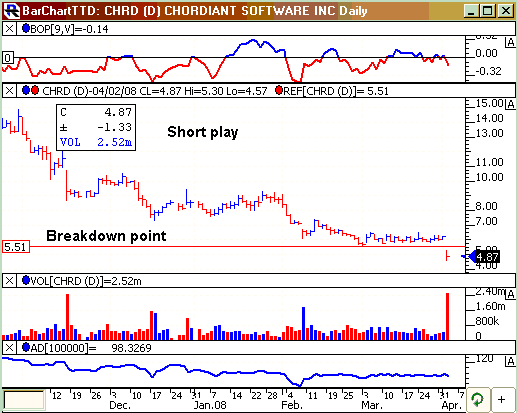CHRD, based in Cupertino, Ca., develops customer relationship management software. Annual revenues: $131 million. CHRD falls sharply today after forecasting a loss for the fiscal second quarter ended March 31. The news came as a surprise. So far today, CHRD is trading 2.7 million shares, five times its normal daily volume of 456,000 shares. TTD sees more on the downside even though the stock seems low already.