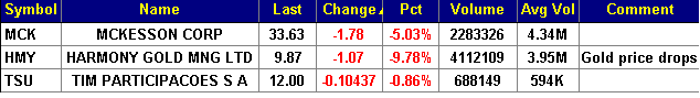 MCK, based in San Francisco, distributes dugs and medical supplies. Annual revenues: $106 billion. MCK's stock moves lower today undercutting key support near 35. The stock has been trending lower unable to participate in the stock market's rally. Analyst project a slowing of earnings growth. So far today, MCK is trading 3.2 million shares. The stock's average daily volume is 4.3 million shares.