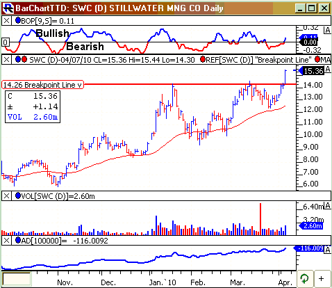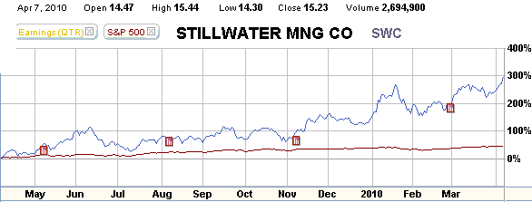 SWC, based in Billings, Mt., mines and sells palladium, platinum and other metals. Annual revenues: $394 million. SWC's stock breaks out from a 12-week, cup-and-handle base today and makes a 52-week high. The move comes with a good expansion in volume. SWC is trading 3.8 million shares so far today, double its normal daily volume of 1.9 million shares.