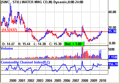 SWC's long-term chart shows the stock soaring to a peak of 50 in 2000 during the bull market. The stock then moved lower the next three years. It then went into a trading range. The stock has long-term resistance near 20. A push over that level would be very bullish.