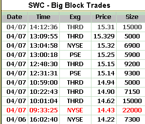 SWC's tape action shows the recent big block trades.