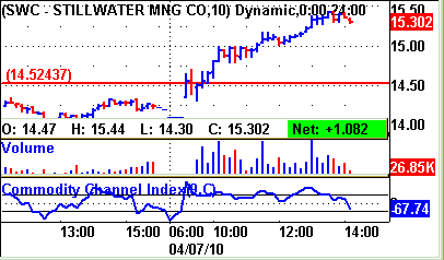 SWC's 10-minute chart shows the stock breaking out in the morning and then pushing higher into the early afternoon.