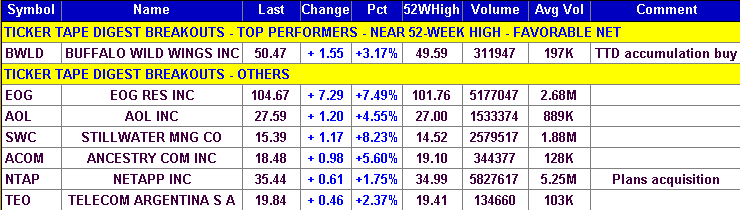 (The information contained has been prepared from data deemed reliable but there is no guarantee of complete accuracy. Ticker Tape Digest Inc. is not affiliated with any broker, dealer or investment advisor. Nothing in this publication constitutes an offer, recommendation or solicitation to buy or sell any securities. Further research is advised. This report is copyrighted and no redistribution is permitted with out permission. Some of the charts are from Telescan, Insight Trading, First Alert and other sources.)