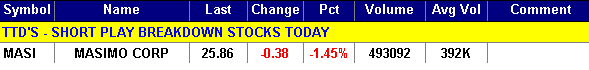 MASI, based in Irvine, Ca., makes non-invasive patient monitoring products that improve patient care. Annual revenues: $349 million. MASI's stock falls below key technical support today with expanding volume. The stock has been a laggard and now is vulnerable to more on the downside. So far today, MASI is trading 576,343 shares. Its average daily volume is 382,000 shares. TTD sees more on the downside.