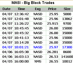 MASI's earnings for the first quarter should rise 4% to 23 cents a share from 22 cents a year ago. That is below its normal growth rate. For the year, analysts project a 14% gain in net to $1 share from 88 cents a year ago.