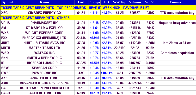 (The information contained has been prepared from data deemed reliable but there is no guarantee of complete accuracy. Ticker Tape Digest Inc. is not affiliated with any broker, dealer or investment advisor. Nothing in this publication constitutes an offer, recommendation or solicitation to buy or sell any securities. Further research is advised. This report is copyrighted and no redistribution is permitted with out permission. Some of the charts are from Telescan, Insight Trading, First Alert and other sources.)