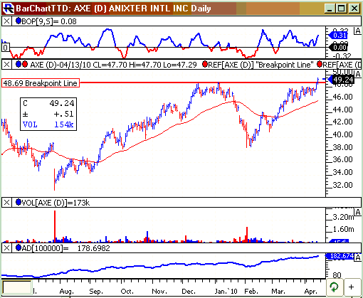 The accumulation - distribution line (bottom of chart) is in a strong up trend and broke out before the stock did today. So, the AD line is leading the price chart. That is bullish.