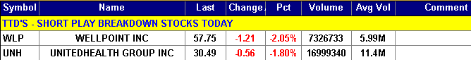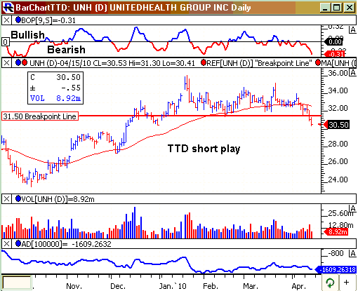 UNH, based in Minnetonka, Min., is a health maintenance firm. Annual revenues: $87.1 billion. HMO stocks are weak today. UNH is a major player in the group and today its stock declines on heavy volume. The move undercuts key support and sets off a TTD short play. So far today, UNH is trading 20 million shares, almost double its normal daily volume of 11.4 million shares.