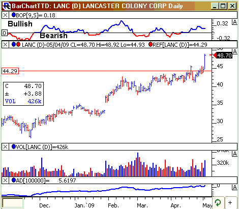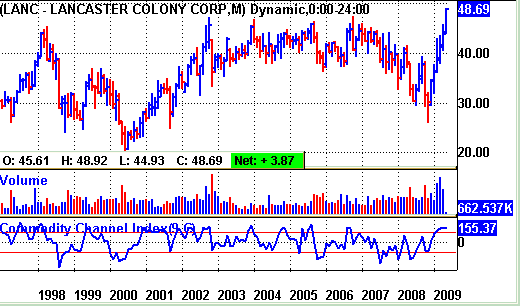 LANC, based in Columbus, O., a diversified firm, makes food products, automotive accessories, glass products, and candles. Annual revenues: $1.1 billion. LANC, a conservative stock, finally clears a seven-week flat base today. The stock had a breakout two weeks ago but fell back. Now it reemerges with good power as it hits a new all-time high. So far today, LANC is up about 3 points. Volume is running at 606,660 shares, triple its normal daily volume of 227,000 shares.