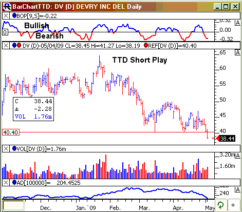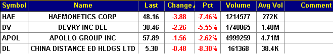 DV, based in Oakbrook Terrarce, Il., is one of the largest for-profit education companies. Annual revenues: $1.2 billion. DV's stock, a part of the recently strong school sector, falls sharply today on expanding volume. Today, the school stocks continue lower with several cutting below key technical support. DV's is trading 2 million shares so far today. The stock's average daily volume is 1.4 million shares. TTD sees more on the downside.