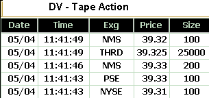 DV's stock moved lower in the morning. it staged a modest rally at mid-morning, but then rolled over and headed South. TTD's clip of the tape shows a big block of 25,000 shares crossing in the morning on a modest down tick to $39.32 from the prior trade at $39.33. The tape showed heavy institutional selling pressure.