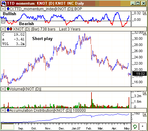 KNOT breaks below key support at 20 today. The stock was acting well and looked poised to rally. But, instead the stock went the otherway - down. TTD is targeting KNOT for a decline to 14 within the next few months. TTD sees KNOT as a trading short for bears.