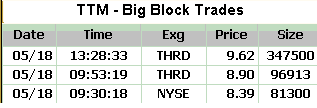 So far today, TTM's stock is up sharply. Volume is running at a heavy 7.2 million shares, almost five times its normal daily volume of 1.5 million shares.