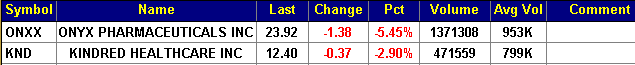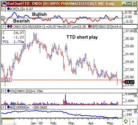 ONXX, based in Richmond, Ca., develops and markets novel therapies that target molecular mechanisms that cause cancer. Annual revenues: $194 million. ONXX's stock fall sharply today after the company filed a suit against Bayer Corp. over anti-cancer products. ONXX's stock breaks below key support near 25 today on expanding volume. TTD sees more on the downside.
